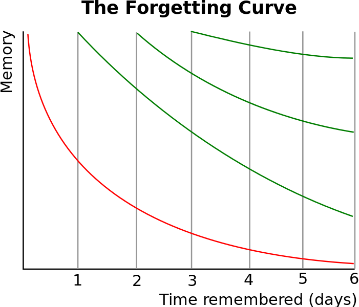 德国科学家研究了艾宾浩斯遗忘曲线后认为,既然遗忘的速度是先快后慢,那么在一开始就需要更频繁和及时的复习,之后可以逐步加长间隔--也就是间隔式复习:不断增加每次复习的间隔时间。